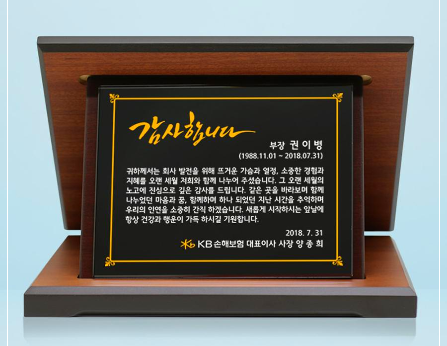 평소 확고한 국가관과 투철한 사명감으로 정의 사회구현과 선진조국창조를 위해 헌신하시고, 특히 본회 우리지부의 봉사활동과 회원 복지 사업에 물심양면으로 지원하여 주심에 감사드리며 귀하의 정년퇴임을 기념하여 전 회원이 뜻을 모아 이 패를 드립니다.