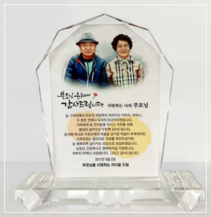 한결같은 사랑으로 저희들을 키워주시고 든든한 버팀목이 되어주신 부모님. 존재만을도 큰힘이 되어주시는 부모님의 70년 인생을 기념하며 축하드립니다. 저희가 받은 많은 사랑의 감사함을 어떤 말로도 다 표현할 수 없지만 부족하나마 이 감사패에 모든 정성을 가득 담아드립니다. 그 큰 사랑에 보답할 수 있게 오랫동안 건강하게 저희들 곁에 계셔주세요. 아버지 어머니 사랑합니다.